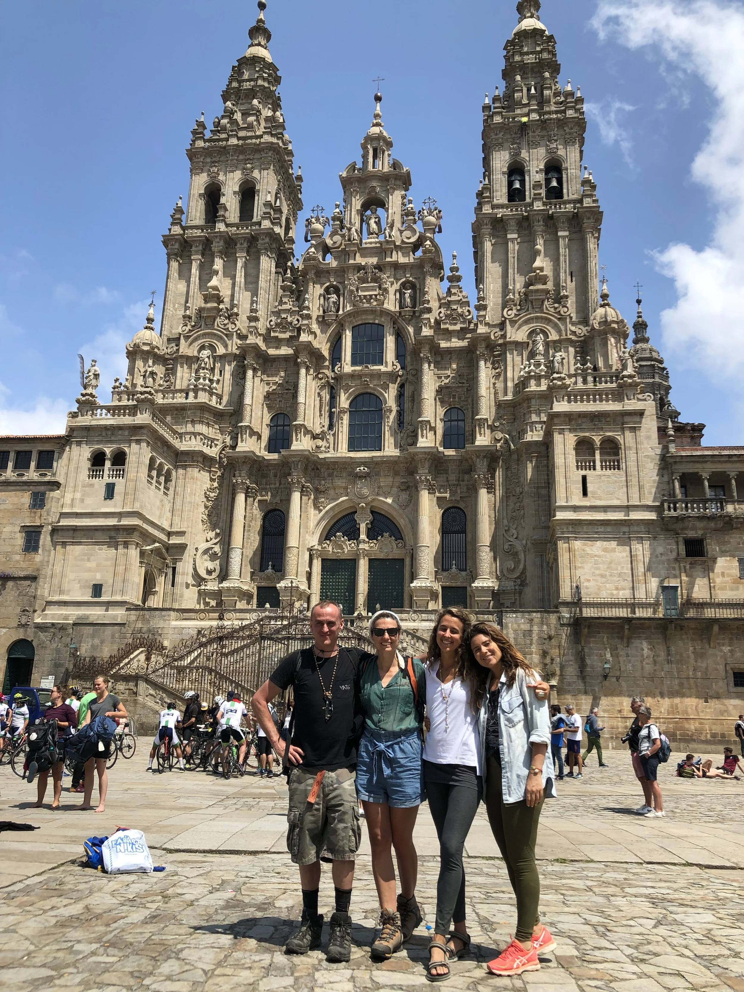 Pure arrival energy in Santiago de Compostela— my friend Gwendoline was serenaded and adorned by traditional musicians. Bagpipes and all.